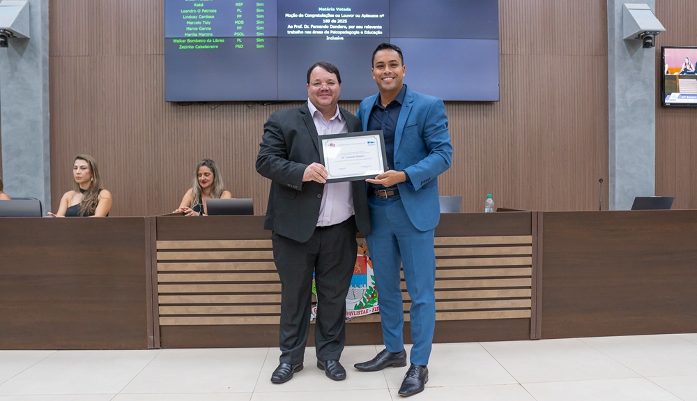 Durante a 45ª Sessão Ordinária, realizada nesta terça-feira, 11 de novembro, a Câmara Municipal aprovou por unanimidade a Moção de Aplausos nº 189/2025, de autoria do vereador Walker Bombeiro da Libras (PL), em homenagem ao professor doutor Fernando Dandaro.