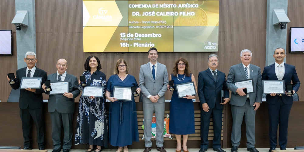 A Câmara Municipal de Franca realizou na tarde de segunda-feira (15 de dezembro), a solenidade de entrega da Comenda de Mérito Jurídico Dr. José Caleiro Filho, uma das mais relevantes honrarias concedidas pelo Legislativo francano. O evento ocorreu no plenário da Casa de Leis e foi marcado por momentos de reconhecimento e emoção.