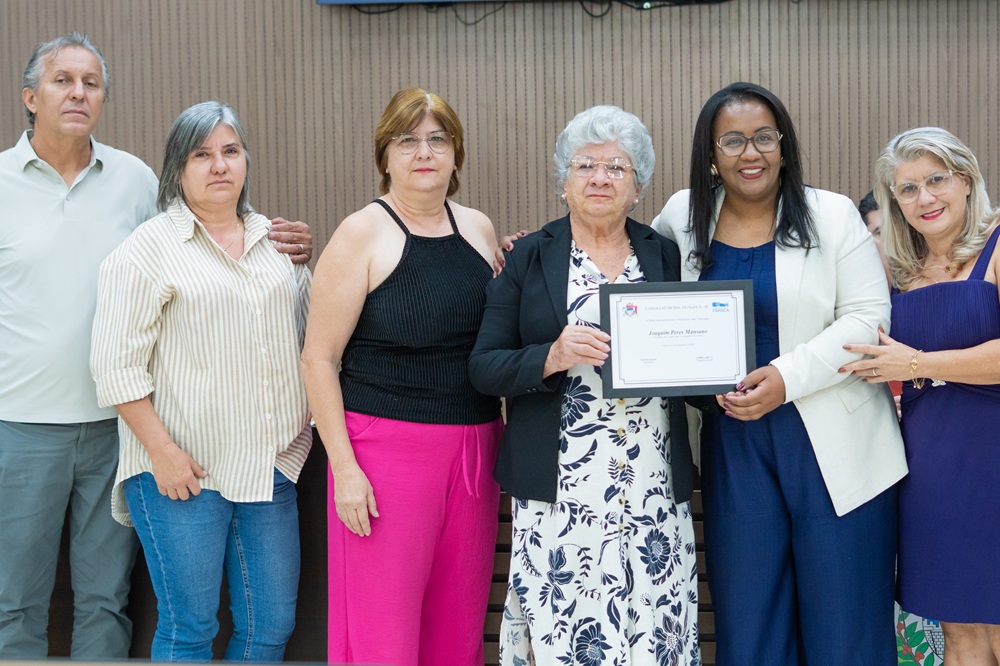 Durante a sessão, foi realizada a leitura da biografia do homenageado, que resgatou sua trajetória desde o nascimento em São José da Bela Vista, a mudança para Franca e a construção de uma vida marcada pela convivência no bairro Estação, pelo vínculo com a comunidade e pela dedicação à família.